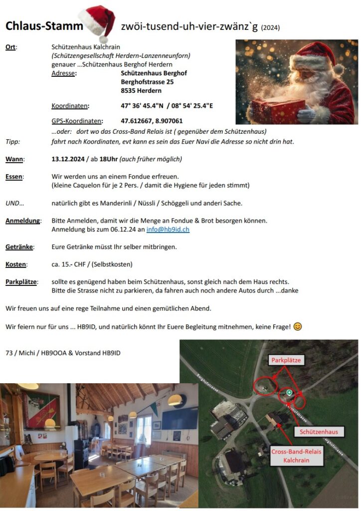 Am 13.12.2024 treffen sich die Mitglieder des HB9ID sowie unsere Kursteilnehmer des HB3-Kurs zum Chlaus-Höck im Schützenhaus Herdern