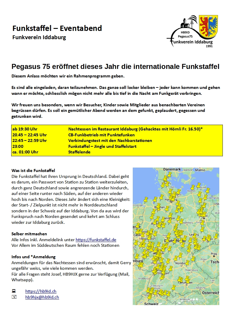 Pegasus 75 eröffnet dieses Jahr die internationale Funkstaffel. Diesem Anlass möchten wir ein Rahmenprogramm geben. Es sind alle eingeladen, daran teilzunehmen. Das